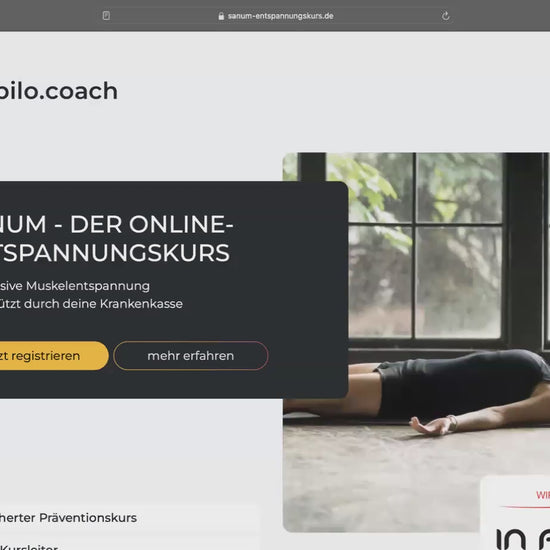 Schritt 1: Sie buchen den online Entspannungskurs. Nach der Buchung erhalten Sie eine Email mit dem Regestrierungs- & Bezahlprozess für den online Entspannungskurs (99€). Erst wenn sie diesen bezahlt haben, können Sie telefonisch oder vor Ort ihren Ersttermin für den "meinGerätekrafttraining §20 Kurs" auf der Fläche vereinbaren.